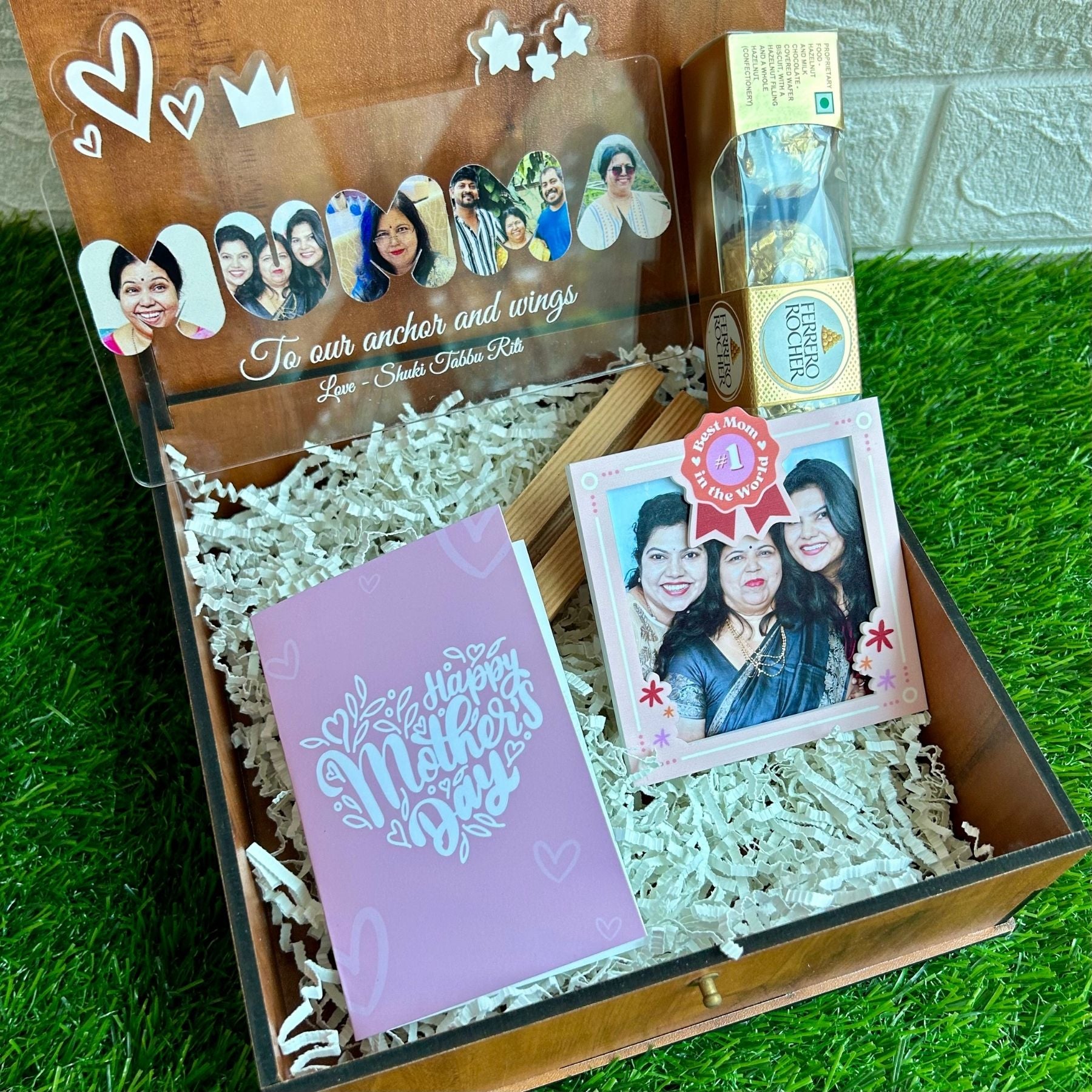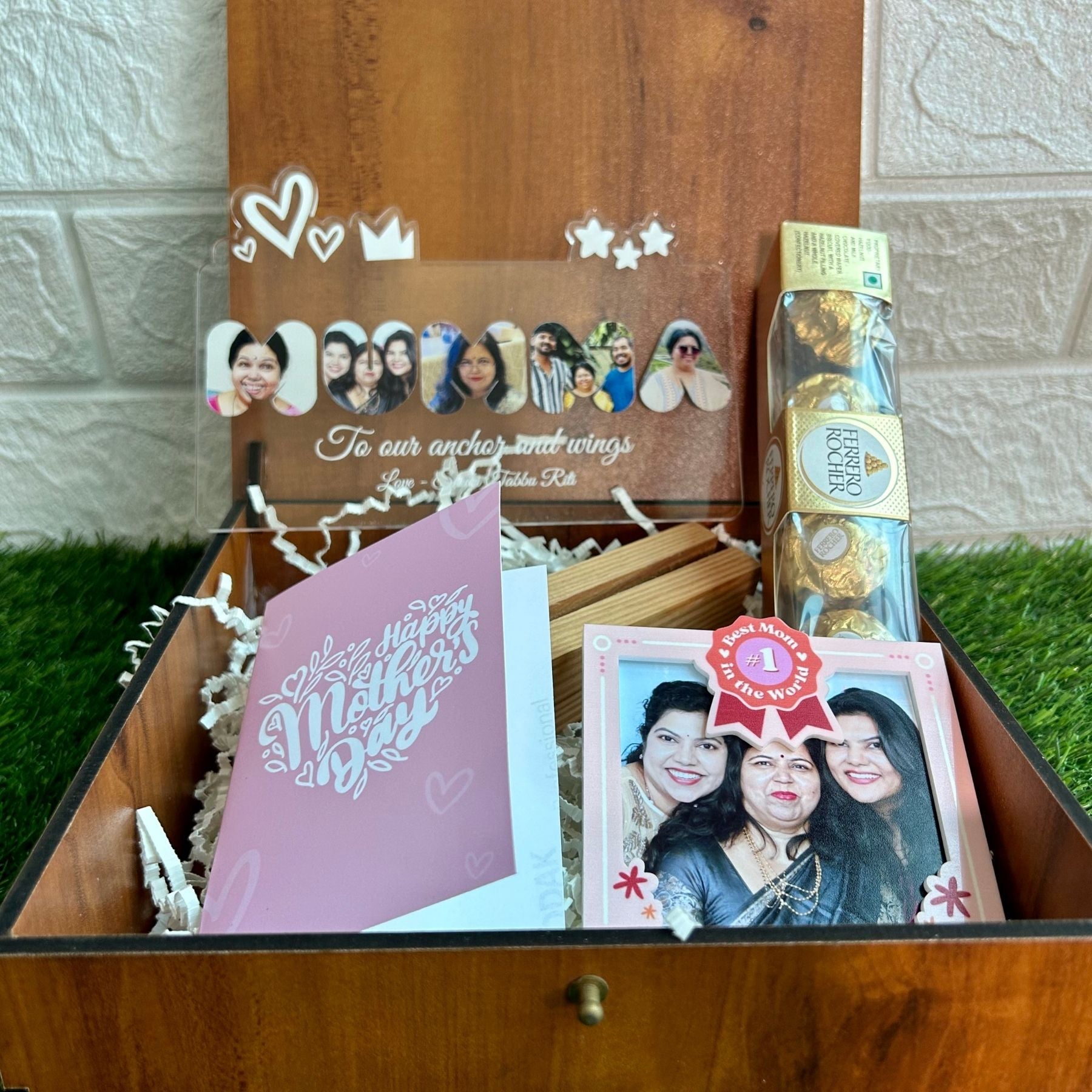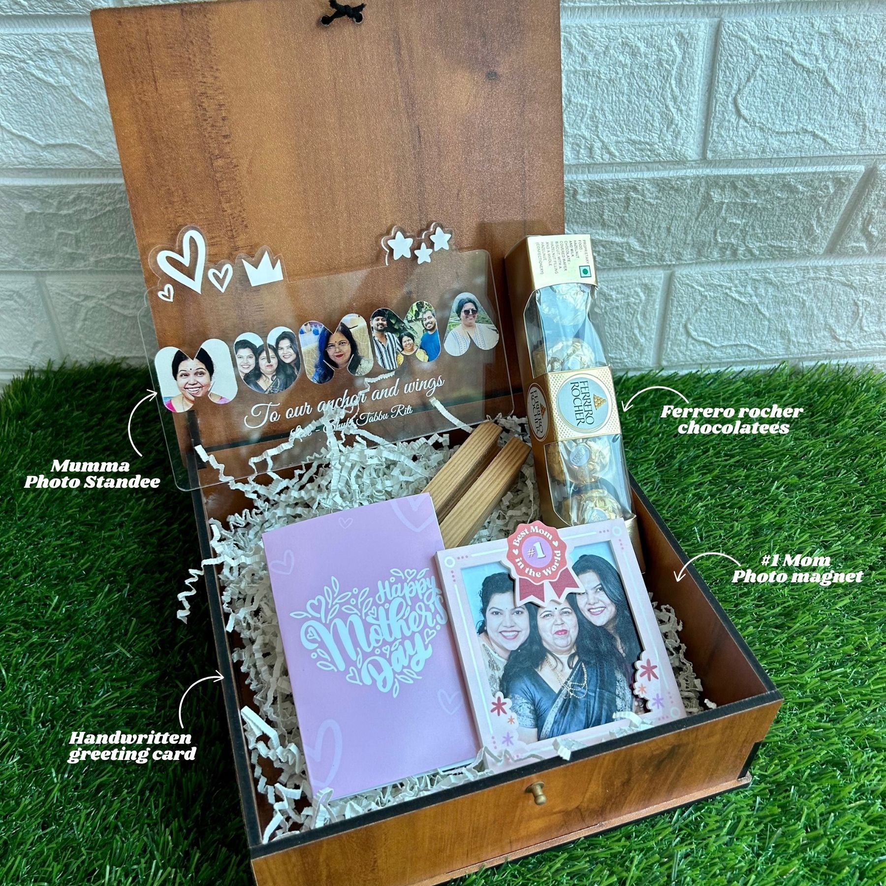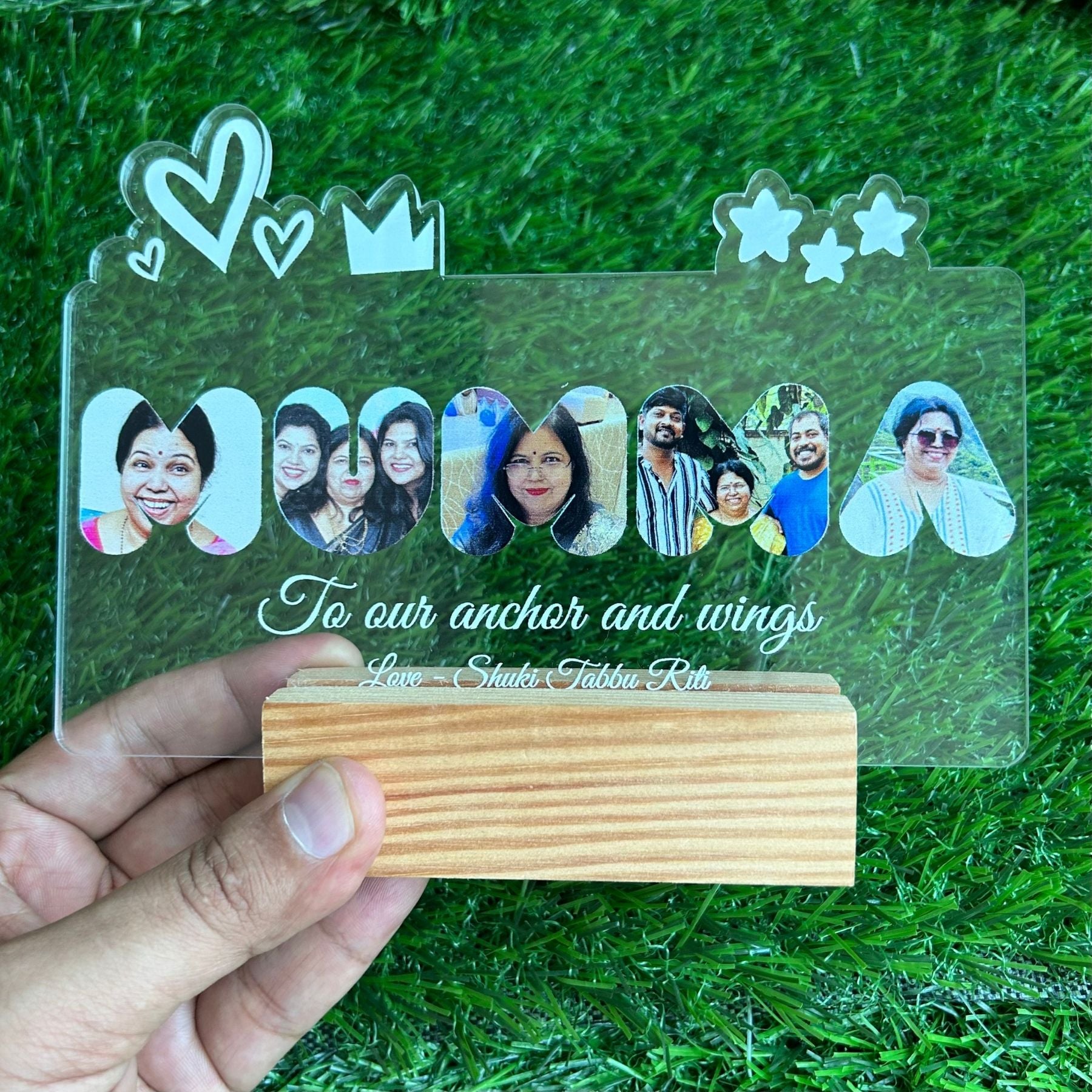 - MUMMA Photo standee with customised photos, comes with a wooden base for elegant display. 7 inch size.