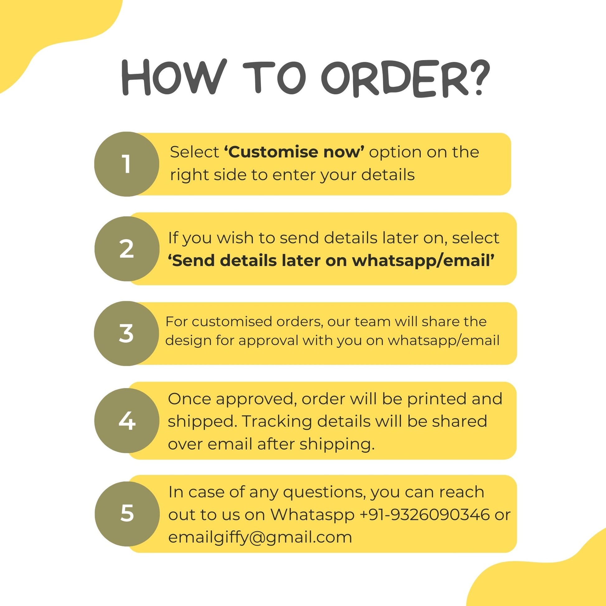 - If you haven't finalised the picture or details yet, you can send them later on Whatsapp +91-9326090346 or email at emailgiffy@gmail.com after placing the order. Please note shipping timeline mentioned above will be counted from the day you send us all the details.