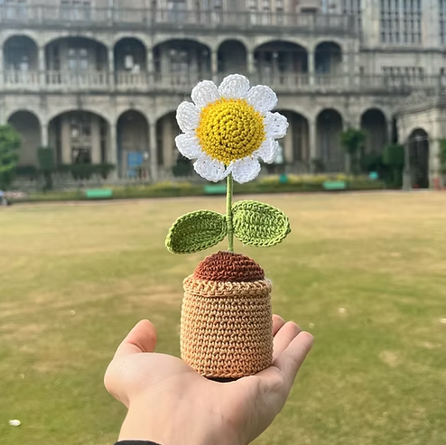 - 🌼 Handmade Crochet Daisy Pot – Symbol of good luck, purity, and joy — this cheerful daisy brings a warm, handmade touch to her desk or shelf.